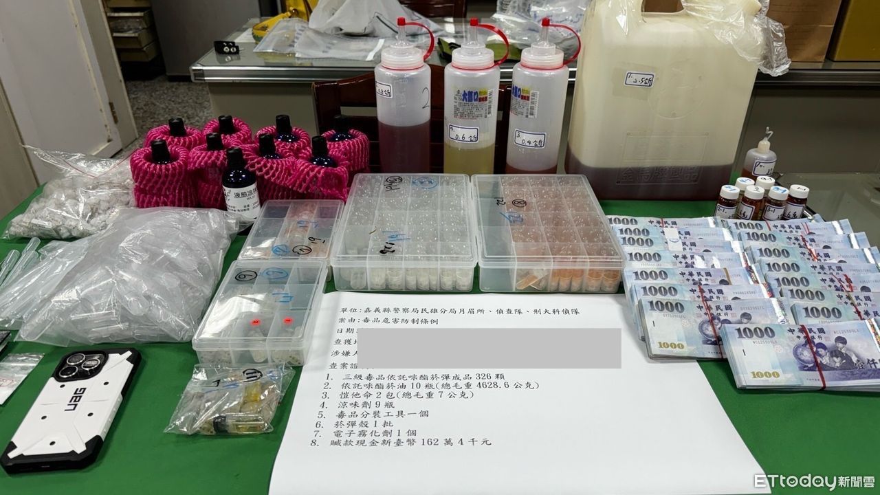 警方持續追查,掌握臺南地區32歲王姓男子及29歲郭姓女子涉有重嫌,案經嘉義縣警察局民雄分局、刑警大隊共組專案小組偵辦,並報請臺灣臺南地方檢察署智股沈昌錡檢察官指揮偵辦,將王、郭2嫌查緝到案,查扣「依托咪酯」菸油4628.6公克、菸彈成品326顆、分裝工具一批及販毒所得162萬餘元,全案依違反毒品危害防制條例移請臺南地方檢察署偵辦。
