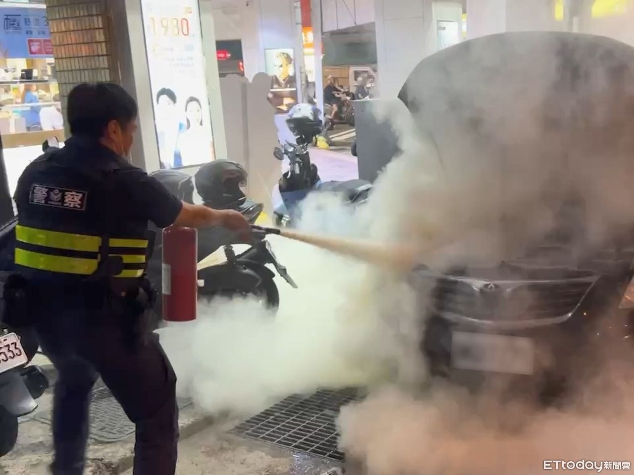 台中市一名杜男近日行經南區時,18年的老車右前車頭燈突然冒出火煙,杜男下車後見火勢越來越大,想拿寶特瓶內的水澆灌,剛好巡邏員警發現此事,立即上前勸阻,並且拿出巡邏車上的滅火器控制火勢,經由消防隊到場協助,順利撲滅這起火燒車事件。