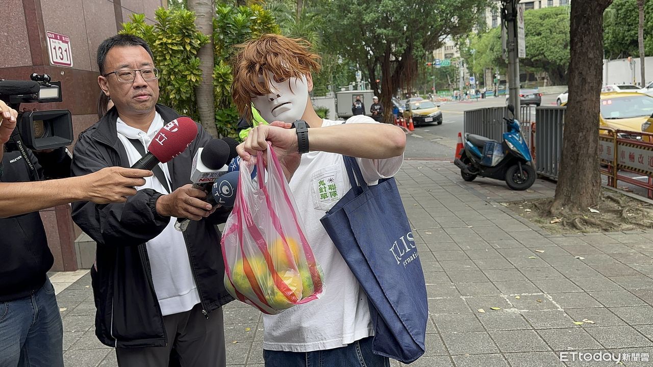 1名戴著全白面具的民眾受訪表示,他自己是從北檢附近的水果行買了一袋橘子,目的是要協助檢察官找橘子,「不是說金流都在橘子那邊?我們就號召網友,把橘子都送來這邊,約定三點,來看會有多少,廣大網友的憤怒程度,會有多少橘子送來。」