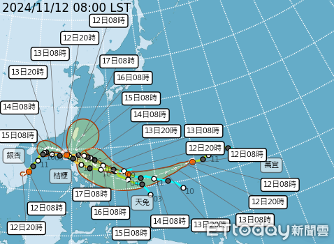 氣象署12日在臉書粉絲團「報天氣-中央氣象署」指出,自12日凌晨天兔颱風形成後,造就罕見的4颱共舞局面,「為何罕見呢,因為翻看過去66年(1958年至今)紀錄,在西北太平洋及南海『11月』有4颱共舞的情況從來不曾發生過)。