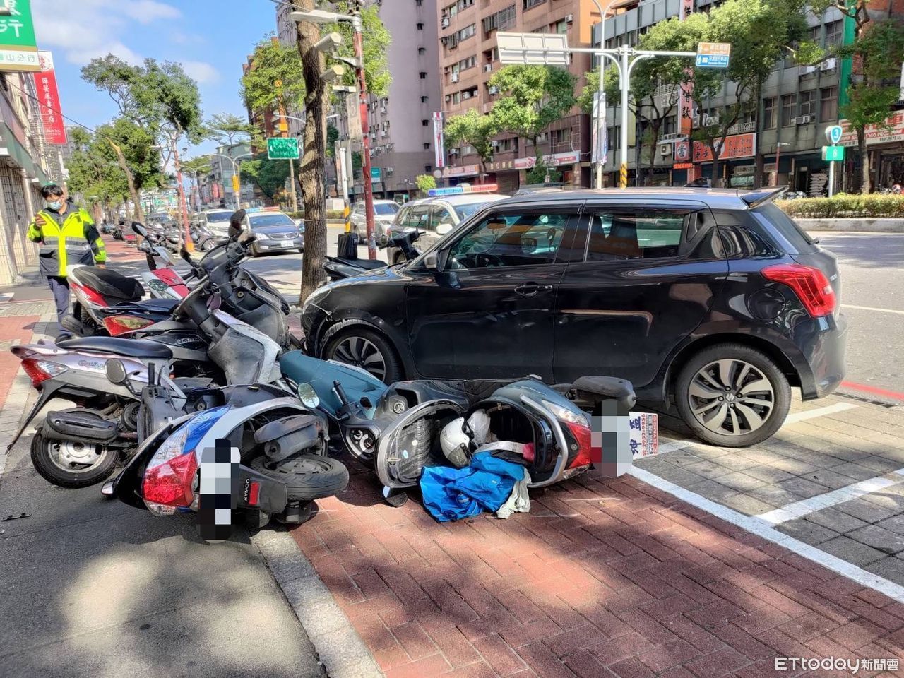 ▲▼板橋轎車詭偏衝上人行道,9輛機車慘被撞。(圖/記者陸運陞翻攝)