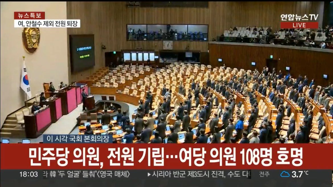 綜合《韓聯社》等韓媒及國會直播畫面,國民力量黨除安哲秀以外,所有議員針對金建希特檢法案進行投票後便離開議場,抵制稍後的尹錫悅彈劾案表決,代表彈劾案恐怕難以過關。