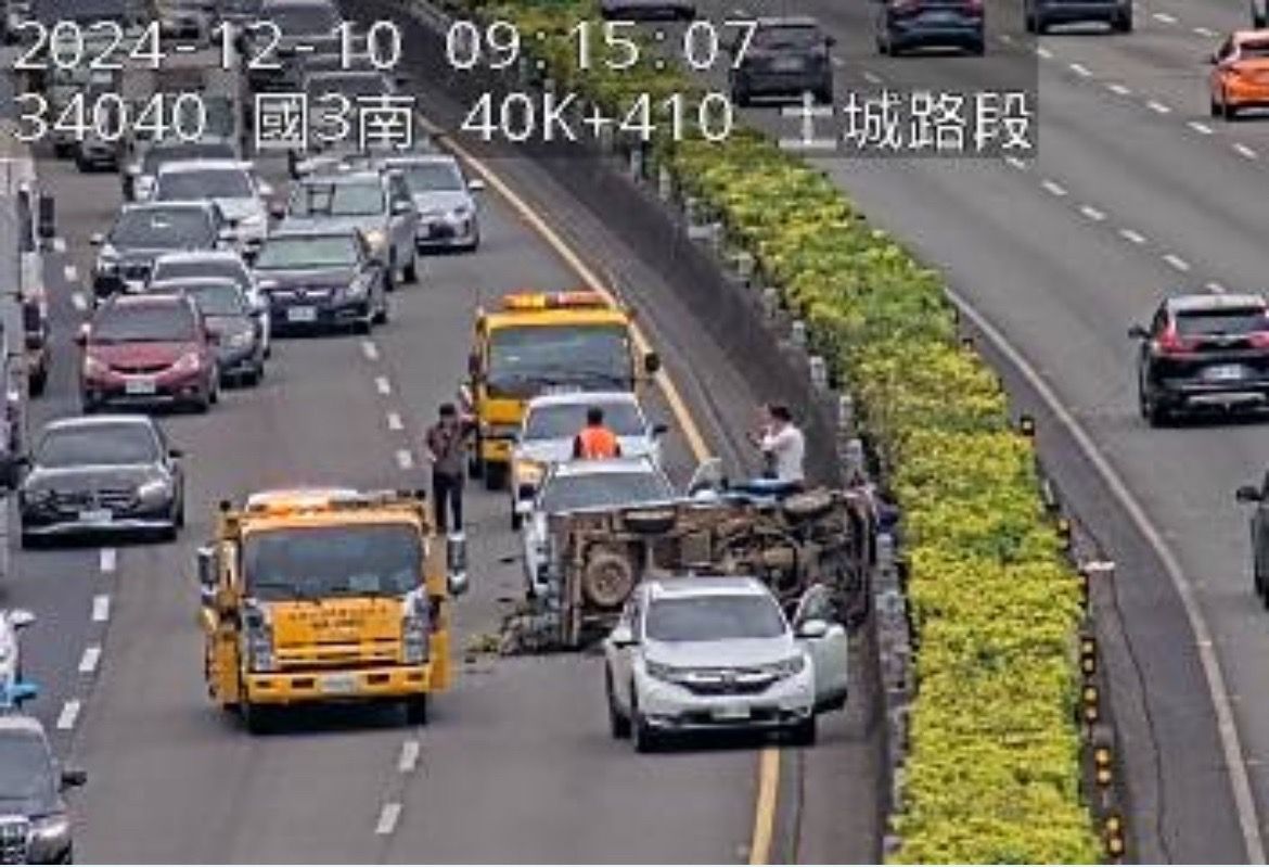 國道3號北向40.2k土城段,今(10)日早上9點11分發生多車追撞交通事故,其中一輛90度側翻,占內2線道,詳細事故原因仍待調查釐清。