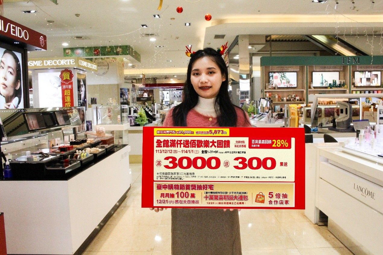為歡慶耶誕及跨年,豐原太平洋百貨推出最高達28%的購物回饋,將於12/12(四)~114/1/1(三)全館1-7樓+9樓(部份除外)卡友當日單筆消費滿3000送300,可累送。12/12(四)~12/31(二)刷國泰世華信用卡享三重好禮:當日刷卡滿6600起即贈百貨禮券,最高加贈1500、刷國泰世華CUBE信用卡當日滿2萬再加贈300,最高還享3.3%回饋!