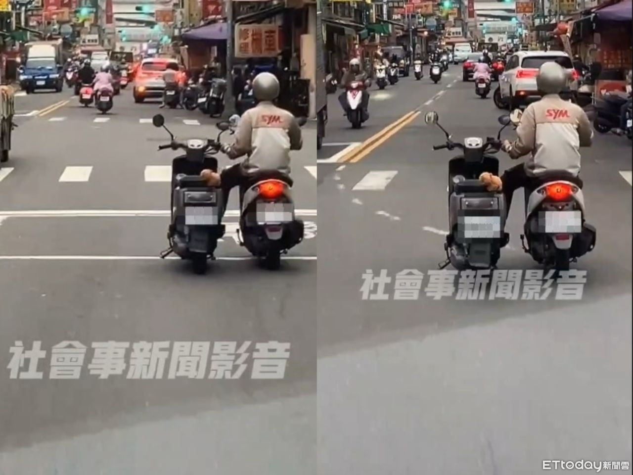 網路社群《社會事新聞影音》流傳一段影片,一名穿著制服的機車行員工右手騎乘機車,左手卻扶著另部機車的右邊握把,左腳則跨在另部機車的腳踏板上,試圖一人同時操控2部機車。