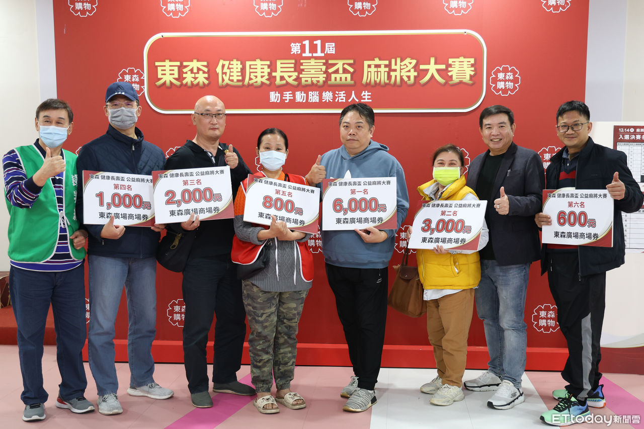 ▲第11屆「東森健康長壽盃」麻將大賽熱鬧開打!最終取前六名由東森購物總經理彭鴻珷(右2)頒發東森廣場商品券,並由麻將最大黨裁判長(左1)做見證。(圖/記者黃克翔攝,下同)