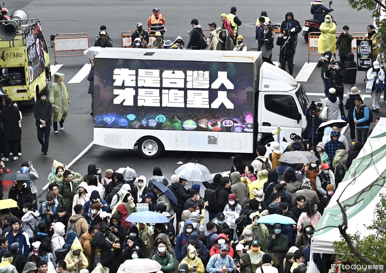 卡車抗議今日出現在立法院周遭,並寫著「先是台灣人才是追星人」、「追星人瘋起來,就沒有賣國賊們什麼事了」、「民主必須用力維護,追星才能成為日常」、「舞台上那人是我擔,拒絕追星團來台亂」等口號。