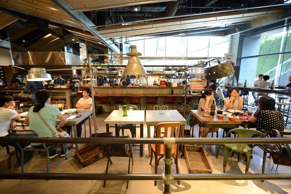 也是首度進駐商場,和華山園區中的創始店相同,菜單上除了少量義大利麵,賣的全是價格親切、適合小酌下酒的義式與西班牙小點,蒜味風乾番茄小章魚、墨西哥燉肉、番茄燉牛肚,都是原本就極受歡迎的招牌菜,三五好友多點幾道配小酒剛剛好。空間也維持一貫工業風,近兩公尺高的大型抽風扇、歐洲搜羅來的老工業鐵椅、彰化老糖廠回收木製成的活動長桌,加上數盞大型古老手術燈、探照燈、攝影棚燈,全是為呼應40年代松山菸廠極盛時期主題。在商場裡小酌聽來很怪,但坐進這擁有大片落地窗的角落,看著窗外整片植生牆綠意與天光喝一杯,其實倒還挺愜意的。