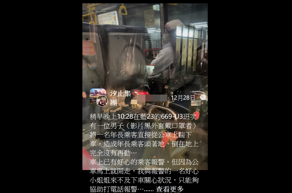 汐止警方表示,28日22時28分獲報該輛公車上發生男子與老先生的口角肢體衝突,警網到場陳男(70歲)因頭部撞擊地板已經送醫治療觀察,衝突起因僅是因為到站下車時因推擠,雙方肢體發生碰撞,進而衍生口角與肢體衝突。