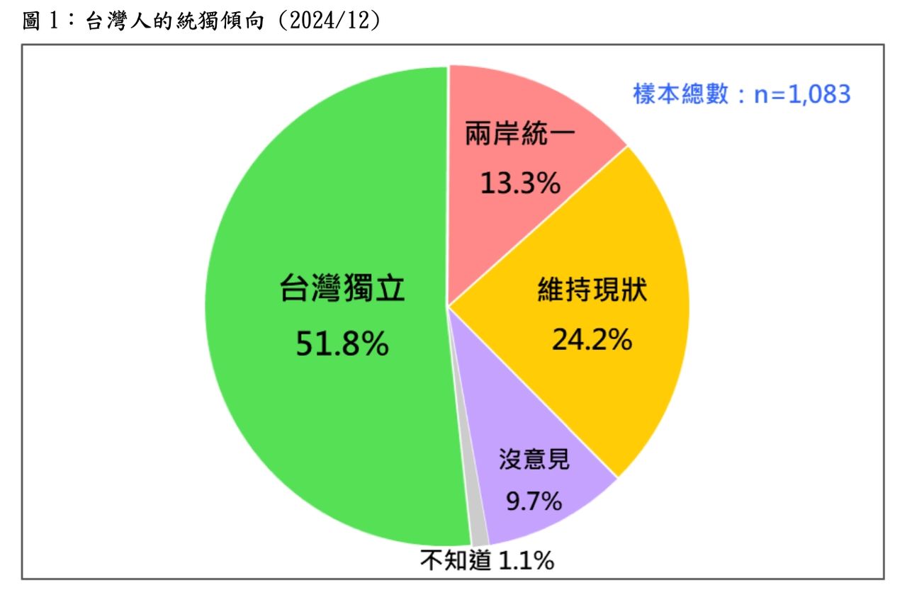 台灣民意基金會30日公布最新民調,針對「台灣人統獨傾向的新發展」,「台灣獨立」是五成二台灣人對未來的選擇,兩成四選擇未來仍「維持現狀」 、一成三選擇未來「兩岸統一」,整體來看,自 2024年1月民進黨的賴清德當選總統以來,台灣人統獨傾向出現明顯的變化,期盼台灣未來要獨立的人上揚7.6個百分點,期盼未來繼續維持現狀的人下滑9.1個百分點。