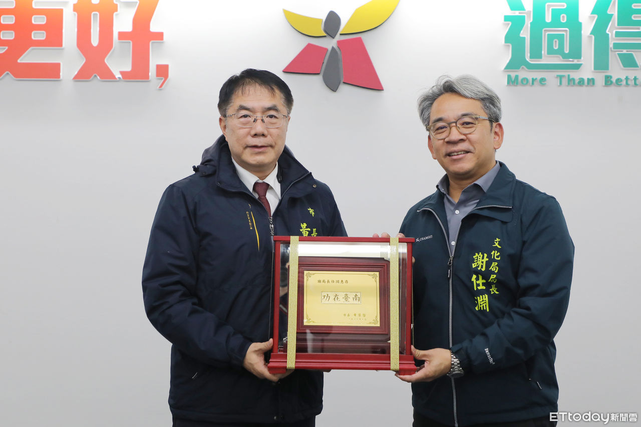 ▲台南市文化局長謝仕淵即將卸任回歸成功大學任教,31日於市政會議中,市長黃偉哲特頒贈感謝紀念牌,肯定謝局長在1年9個月任期內所做貢獻。(圖/記者林東良翻攝)