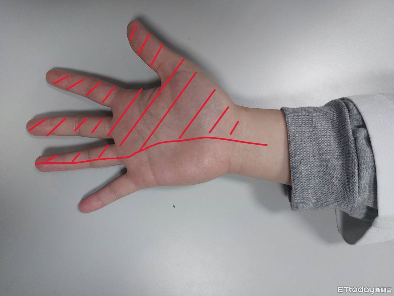 ▲圖1:正中神經壓迫時,手部受影響範圍。(圖/台中榮總埔里分院提供,下同)