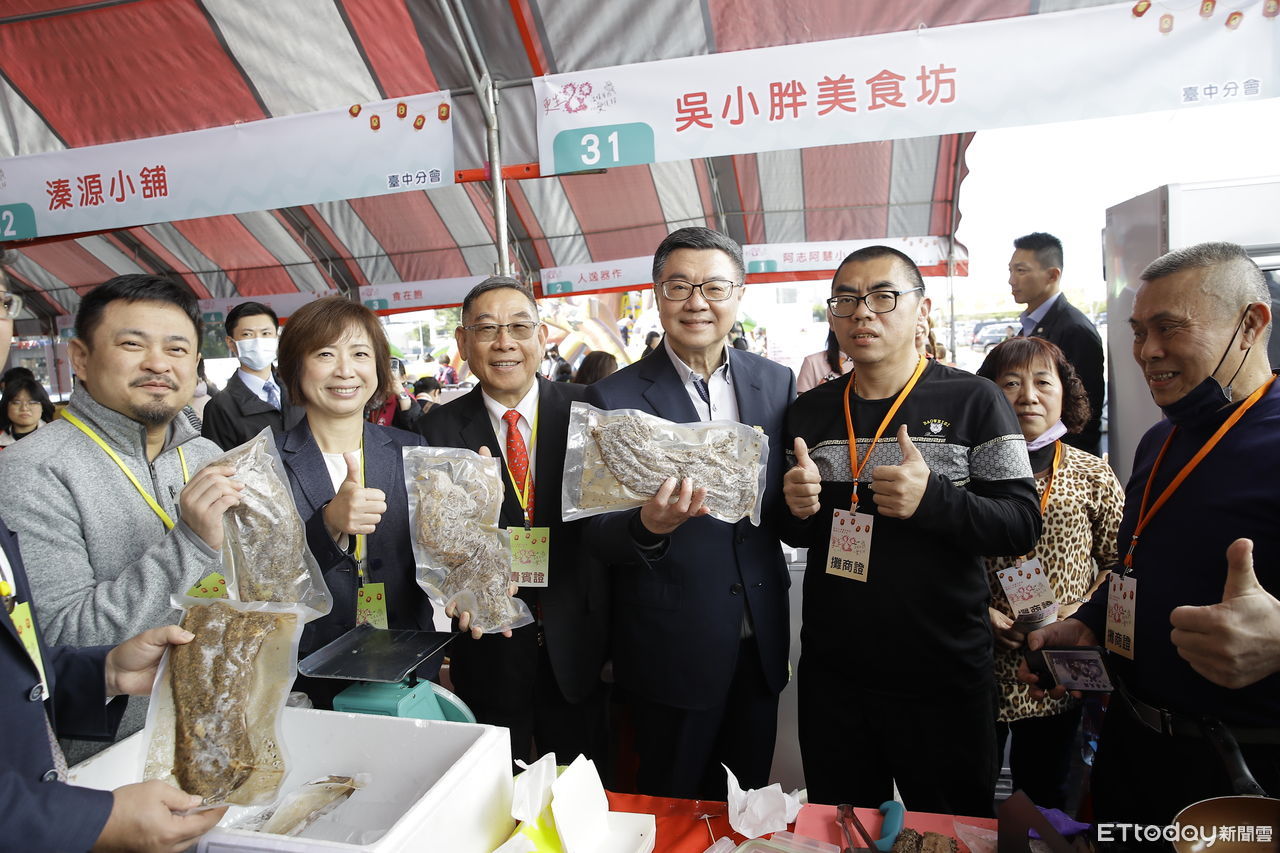 ▲吳小胖(右3)的鹹豬肉,在今年更生年貨大街上,獲得行政院長卓榮泰(中)推薦。(圖/臺灣更生保護會提供)