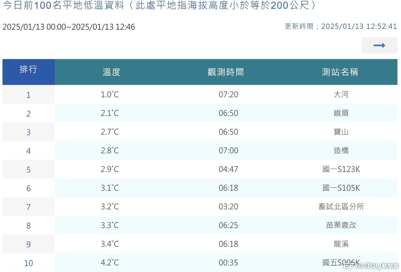 氣象署觀測資料顯示,今天平地最低溫,於清晨7時20分在苗栗縣三灣鄉僅1度,清晨6時40分新竹縣峨眉鄉、清晨6時50分新竹縣寶山鄉,分別出現2.1度及2.7度。