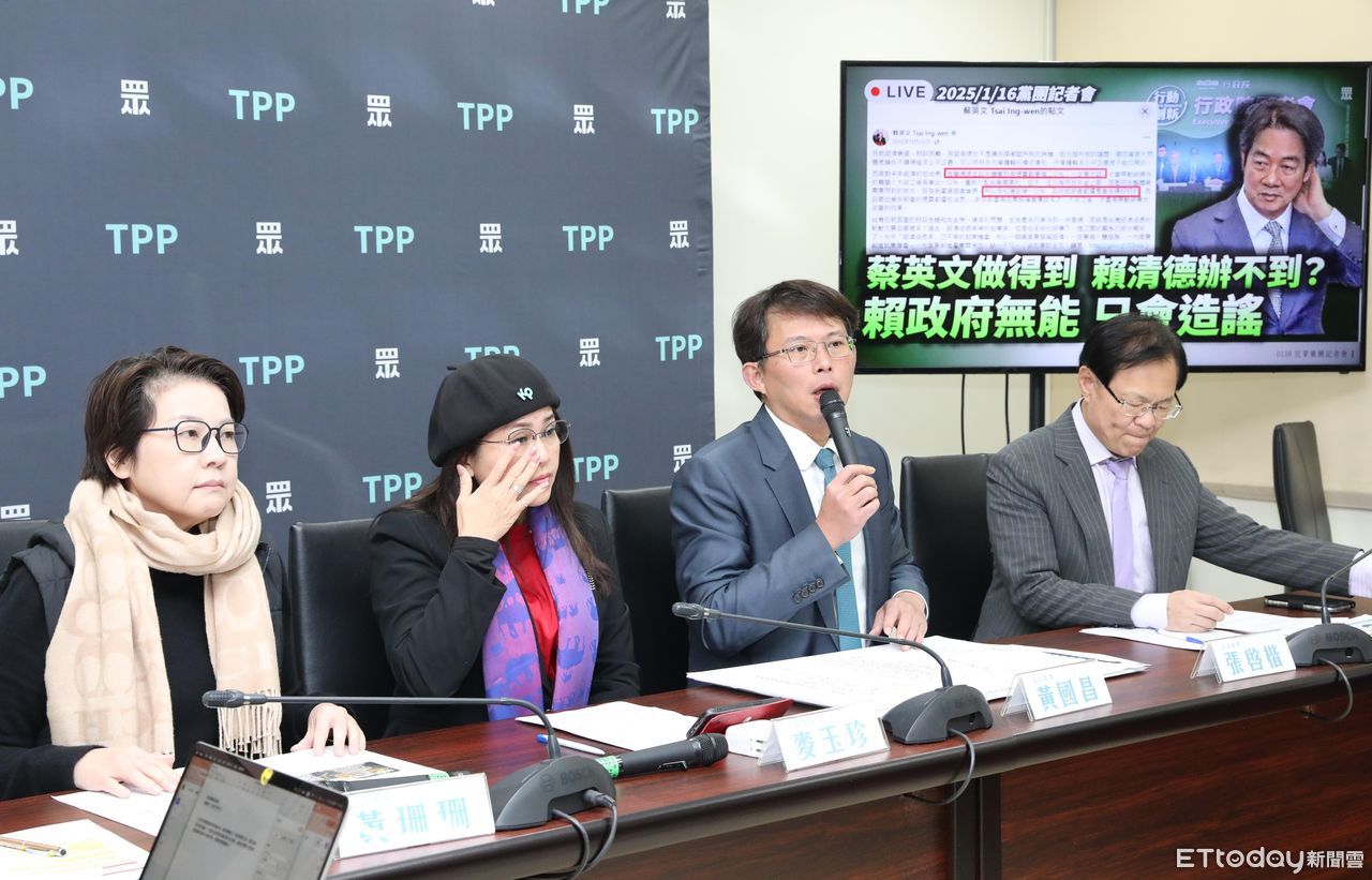 民眾黨團總召黃國昌、幹事長麥玉珍、立委張啓楷與黃珊珊16日下午召開「蔡英文做得到,賴清德辦不到?賴政府無能,只會造謠」記者會,痛批行政院院會後記者會,部會首長一字排開哭窮,猶如大型造謠詐騙現場。