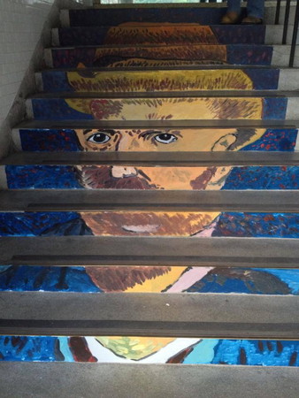 該校美術老師展現創意,將裝置藝術的構想與教學結合,讓各班學生大家一起來模擬繪製梵谷畫作,以水泥漆為原料,以可黏貼的博士膜作為畫布,先將一大捆的博士膜,依樓梯立面的尺寸裁切為條狀,全班同學進行分組,各組同學必須將完整的梵谷作品進行分解,每位同學負責一條條的博士膜,每一條博士膜只是畫作的一小局部,當每一條作品貼滿於樓梯立面後,整個樓梯間呈現出一完整的作品,於是校園平淡生活中,隨時都會充滿著美麗和趣味。