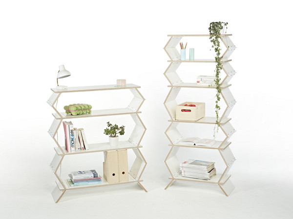形狀有點像手風琴的Stockwerk利用兩側板子跟層板間的卡榫,使用者在使用時只需輕鬆的將折疊處拴上卡榫,空間馬上營造出來。