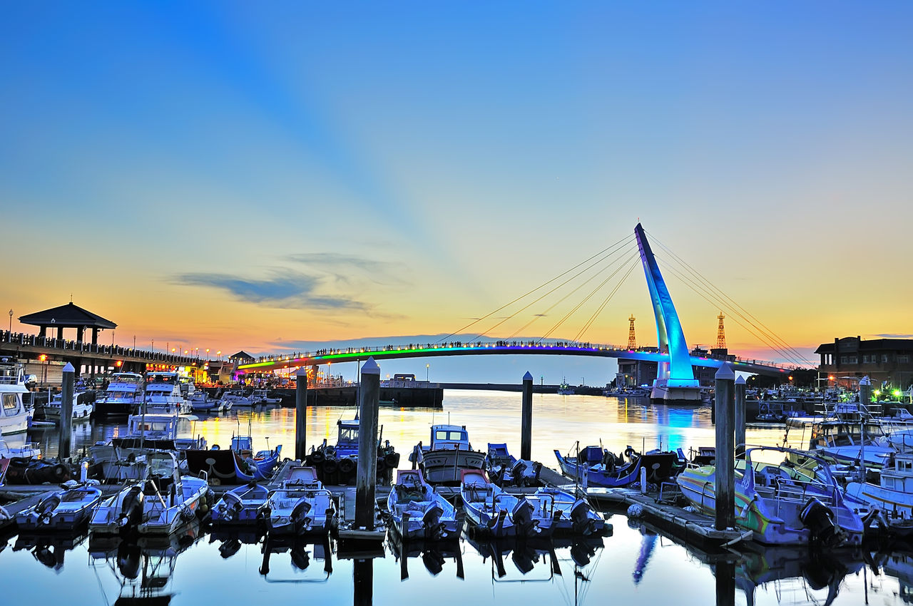 新北漁業處表示,春節來到淡水漁人碼頭,可以悠閒地在木棧道上散步,感受海風的輕拂及海洋氣息,欣賞如畫的海港美景,尤其是地標情人橋,從白天到夜晚的景色都各具風情—白日裡的情人橋,猶如白色風帆橫跨在港區,與周圍藍天相互輝映成美景,隨著夕陽的西下,金黃的光輝灑落水面,形成一幅美麗的畫卷,吸引不少遊客和攝影者來到這裡追逐絕美落日,而入夜後的情人橋照亮港區,更呈現出夜間不同的美麗景象,浪漫氛圍十足,是情侶約會的最佳場所。