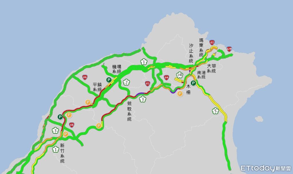 今天大年初一,國道出現走春出遊車潮,根據高速公路局1968即時路況顯示,目前北部國道較為壅塞,部分路段出現「紫爆」,時速最慢僅剩10公里;南下路段稍早也因發生事故,一度回堵5公里。