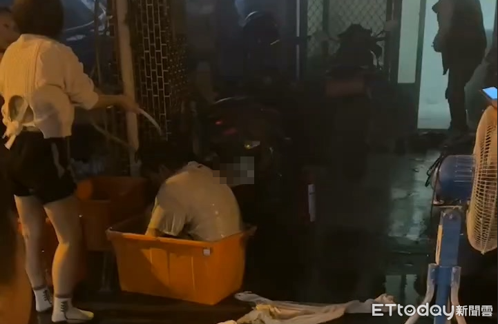 ▲ 花蓮市廣東街一民宅發生爆炸,男全身50%二度燒燙傷,坐在水桶內林水。(圖/記者柯政誟翻攝,下同)