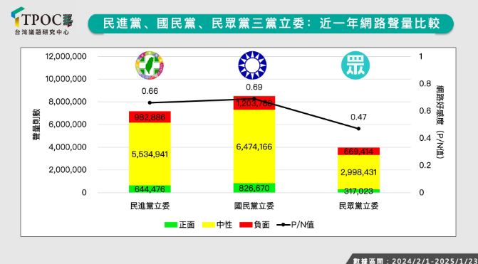 接著,TPOC進一步分析「三黨立委聲量」,數據分析顯示,國民黨立委在過去一年來總聲量超過850萬則居第一,民進黨立委擁716萬則,民眾黨立委擁398萬則,藍綠總聲量差距高達7%,雙方好感度則不相上下,約落在0.69至0.66之間。