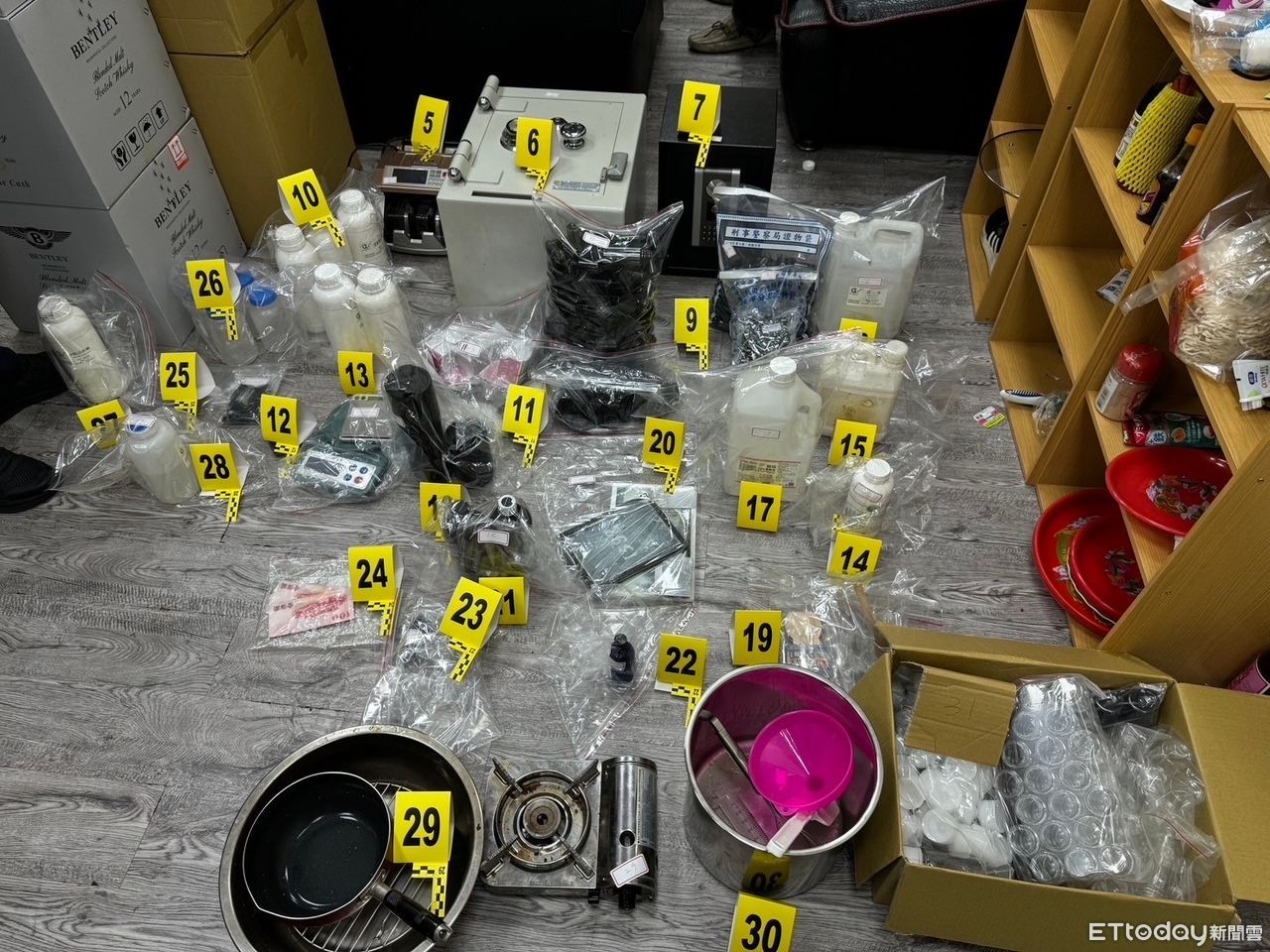 ▲桃園檢警查獲以檳榔攤為掩護的喪屍菸彈製毒販毒集團,查獲成品及半成品。(圖/記者楊熾興翻攝)