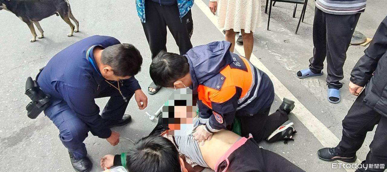 ▲救護人員將食道內的貢丸取出,再以心肺復甦術及使用自動體外心臟去顫器,恢復女子生命跡象。(圖/新城警分局提供,下同)