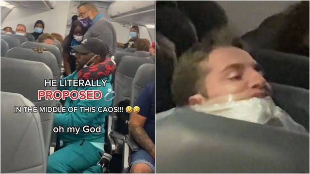 美國網友瑪伊薩(Maísa Barberino)搭到「史上最失控航班」,一名奧客大鬧客艙,甚至開始攻擊旁人,好不容易才被空服員制伏,使用膠帶綑綁在座椅上,奧客前座男子卻又突然起身,向身旁女友求婚,讓場面再度陷入一片混亂。