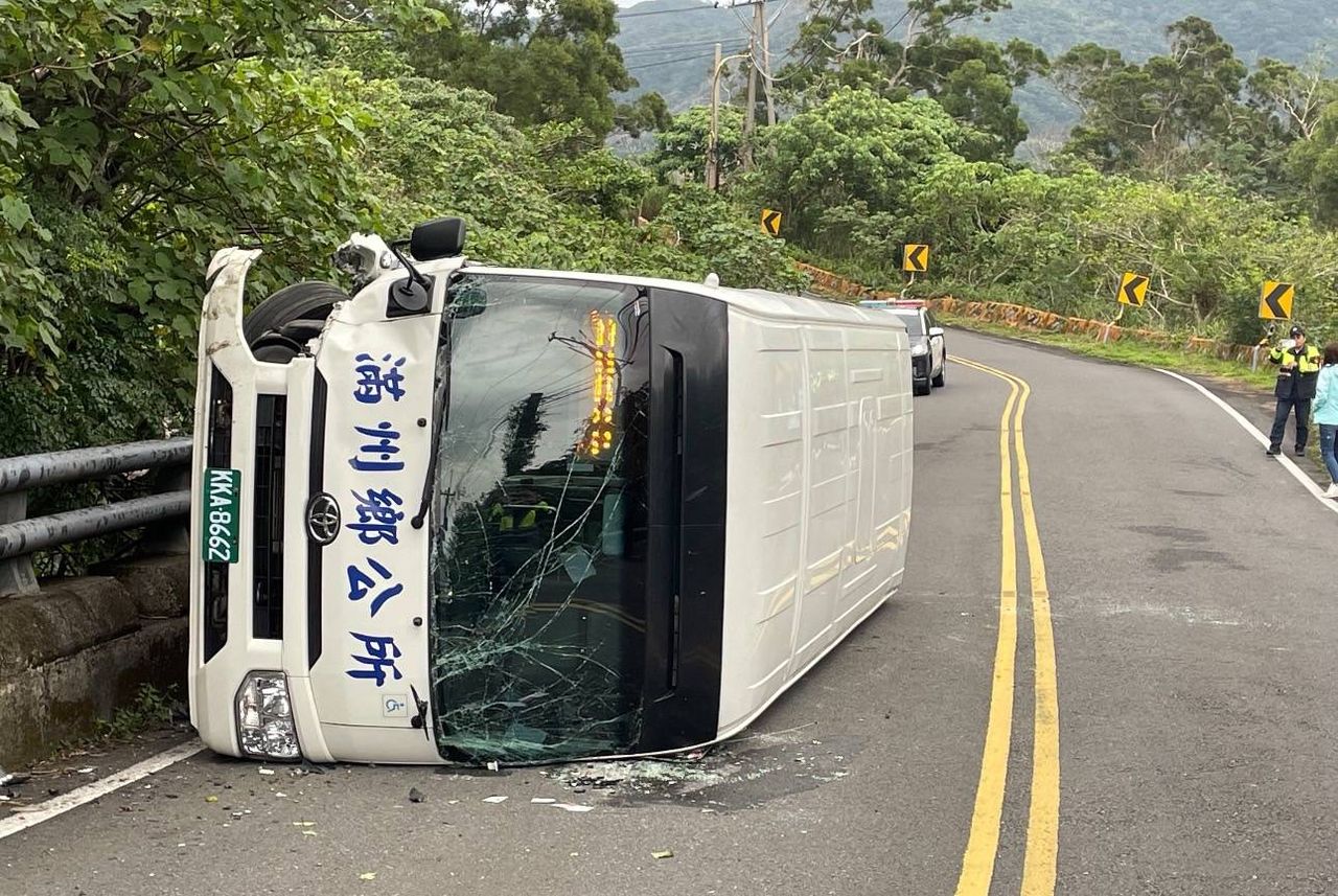 ▲滿州鄉公所幸福巴士閃突然竄出猴子,方向盤猛轉翻覆 。(圖/民眾提供)