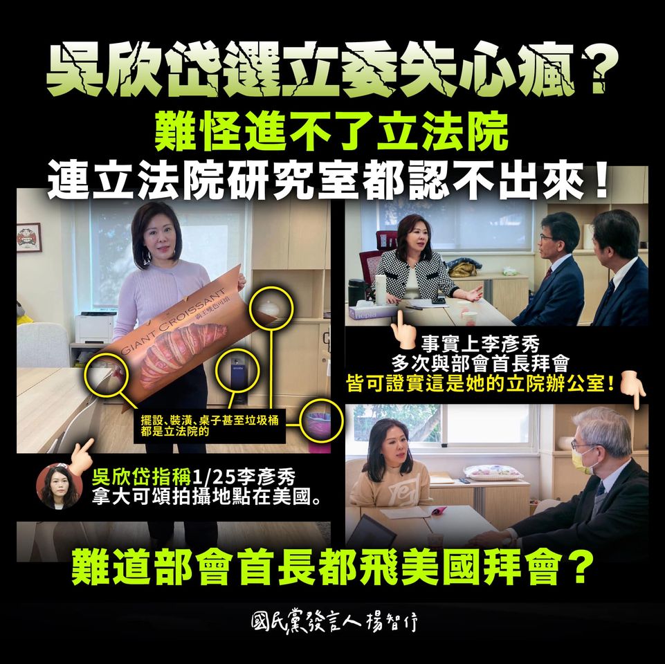 國民黨立委李彥秀捲入美國房產爭議延燒,台灣基進秘書長吳欣岱昨日透過臉書張貼多張「證據圖」,質疑李彥秀在美國擺拍,卻被藍營打臉該照片是在國會辦公室。國民黨發言人楊智伃也批,吳欣岱應為不盡查證義務的誣指造謠公開道歉,「想選立委失心瘋?」