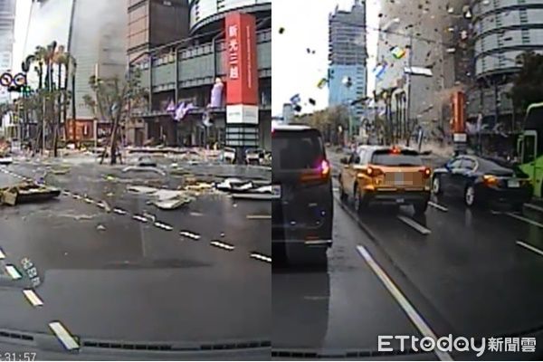 ▼▲新光三越外牆嚴重毀損,地面也滿是散落物。(圖/記者游瓊華翻攝)