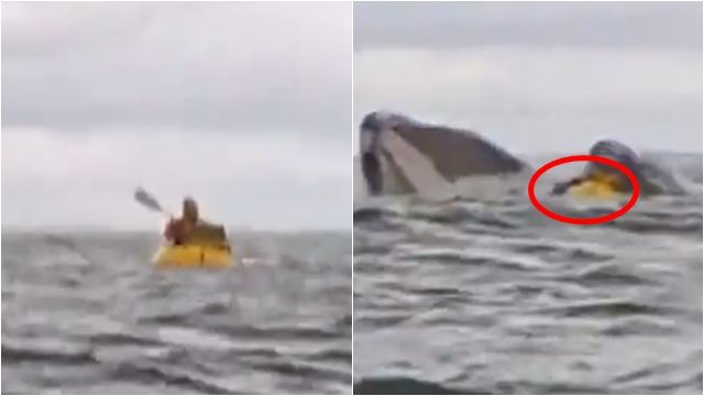 智利巴塔哥尼亞(Patagonia)海域上演驚人畫面,一名年輕男子正在划輕艇,卻突然被一頭座頭鯨吞進嘴裡,幸好短短8秒鐘後,就被吐了出來。上述過程被同行的父親拍下,如今在社群媒體瘋傳。