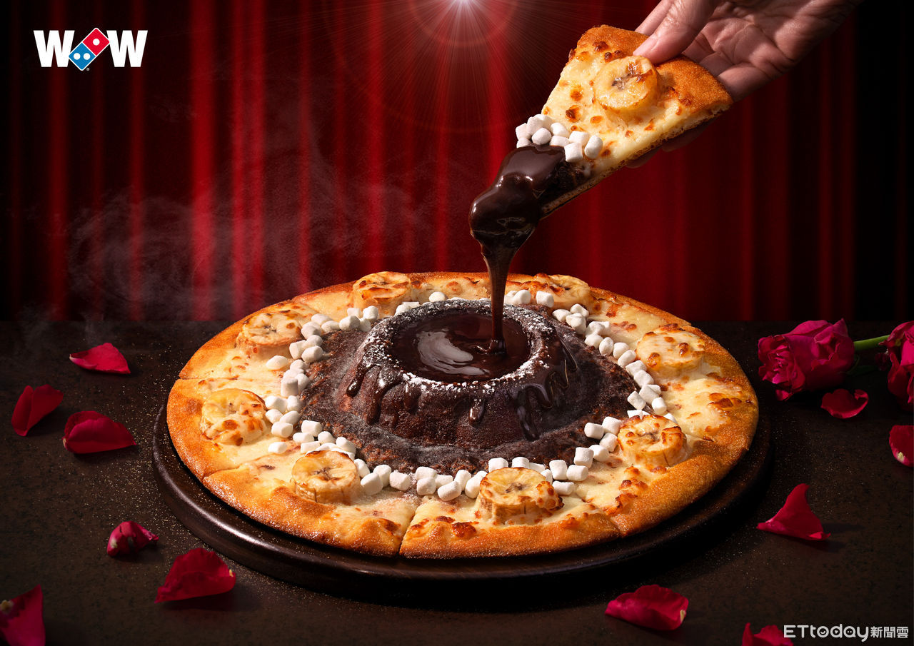 達美樂今年推出情人節限定「可可火山披薩」,選用香濃可可熔岩醬作為主角,搭配台灣在地舊北蕉、莫札瑞拉起司、棉花糖組合成的披薩,打造香甜交織的甜蜜口感,售價740元,即日起於全門市限量發售,數量有限、售完為止。