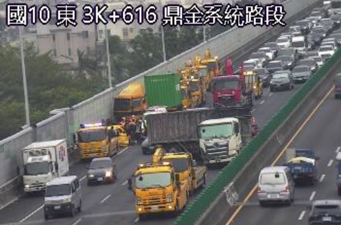 國道10號西向3公里、鼎金系統交流道今(14)日下午3時許,發生一起2台大車和3輛小車的碰撞車禍,一輛聯結車緊急煞車導致「折甘蔗」,整台車橫躺在中央、內側車道,後方一輛計程車疑似遭到波,導致2人受到輕傷送醫,但車禍導致國10西向大塞車「紫爆」,目前僅剩外側車道可以勉強通行,詳細事故原因仍有待進一步釐清。