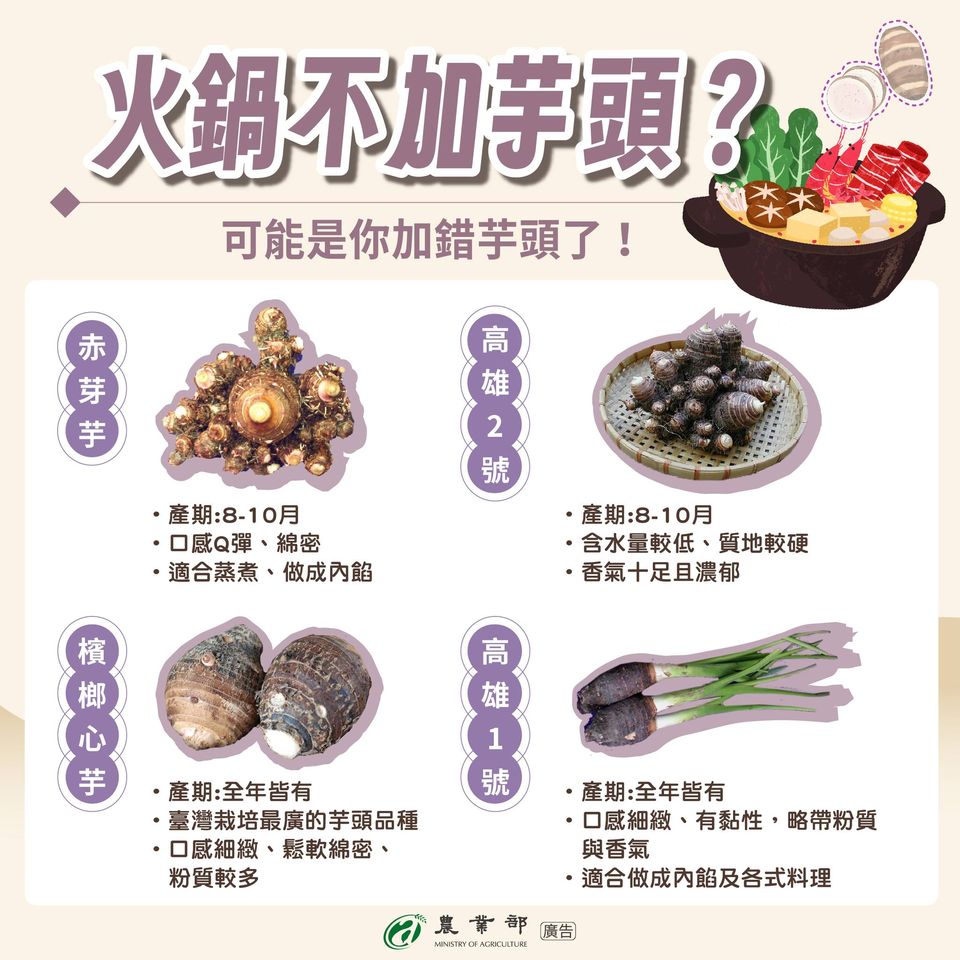 農業部在臉書粉絲專頁發文表示,不喜歡火鍋加芋頭可能是「加錯芋頭」惹的禍,芋頭依植物型態及栽培收穫目的可分為母芋和子芋,口感和香氣有所不同。母芋品種主球莖發達,分球數少,肉質細緻;子芋品種球莖較母芋品種嬌小,分球數多,肉質較黏。