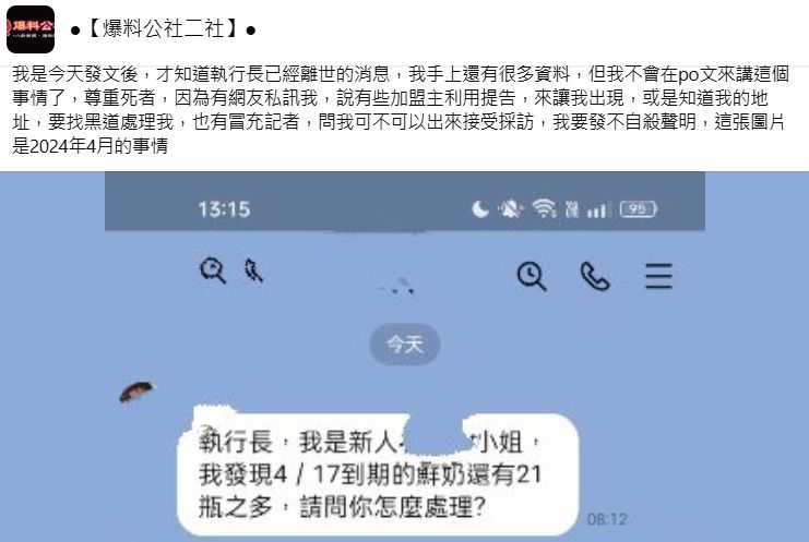 吳姓女網友爆料日春木瓜牛奶使用發霉木瓜後,於昨(16日)晚7時許發布「不自殺聲明」,表示她是發文過後才知道執行長離世的消息,雖然她手上還有很多資料,但尊重死者,所以她不會再PO文講這件事了。