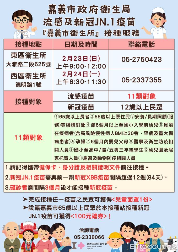 另外為使疫苗接種服務不間斷,嘉義市東、西區衛生所特別於2月23日(日)上午9-12時加開假日門診及2月24日(一)上午開設門診提供流感及新冠JN.1疫苗接種服務,請符合接種資格的民眾攜帶健保卡、身分證及相關證明文件儘速前往接種,以提升免疫保護力,降低流感重症與死亡發生風險。