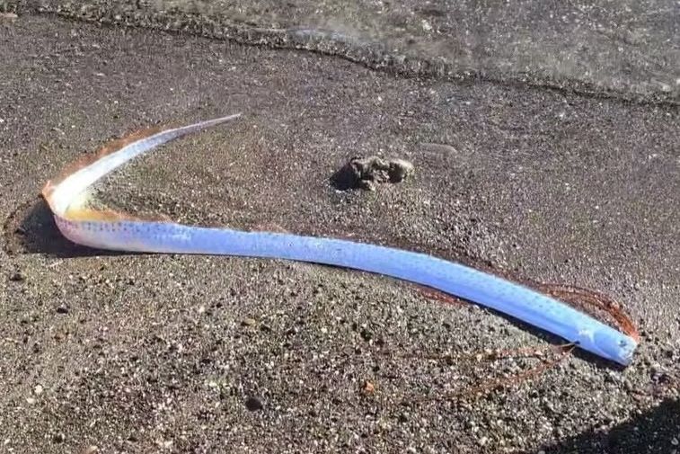 西班牙加那利群島(Canary Islands)近日發現一條俗稱「地震魚」的皇帶魚(Oarfish),銀白色身軀長著橘色半透明鰭,在海灘上瘋狂彈跳。這種罕見生物被視為與地震、海嘯等自然災害有關的「不祥之兆」,影片曝光後迅速引發熱議。
