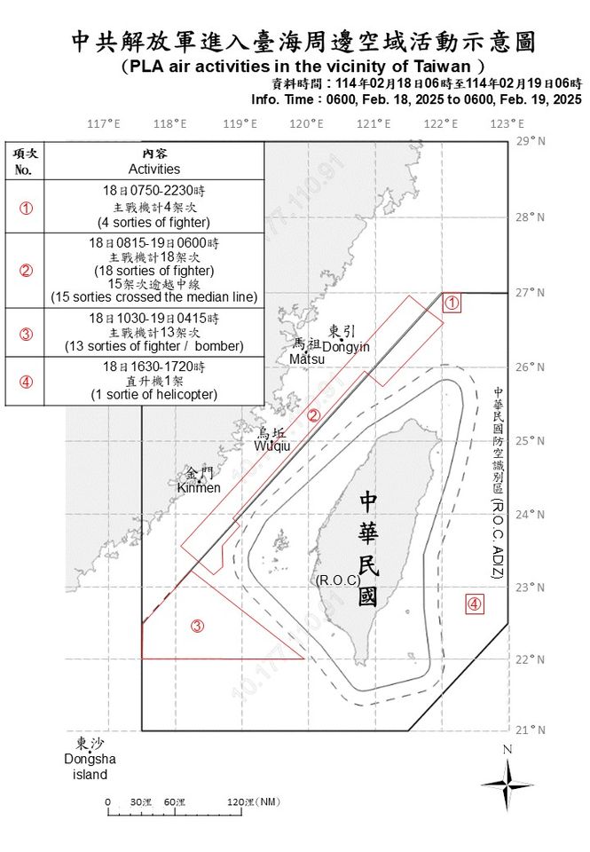 國防部今稍早公布最新共機動態,18日上午6時一直到19日上午6時,有36架次共機出海活動,其中33架次逾越海峽中線進入北部、西南、東部空域,另外,有共艦7艘持續在台海周圍活動。對此,國防部表示,國軍運用任務機、艦及岸置飛彈系統嚴密監控與應處。