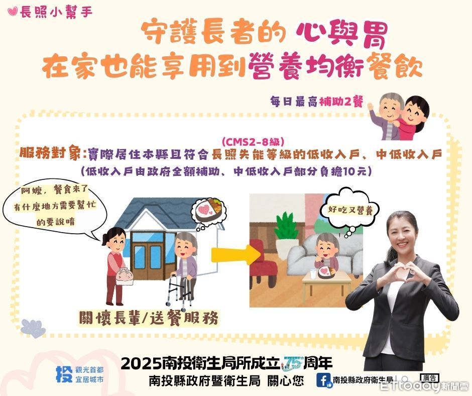 為照顧長者的營養需求,南投縣政府依據長期照顧十年計畫2.0推出「營養送餐服務」:針對失能等級2至8級的列冊低收入戶及中低收入戶、符合領取中低收入老人生活津貼或身心障礙生活補助資格者,提供每日兩餐送餐服務,每餐補助上限為100元。