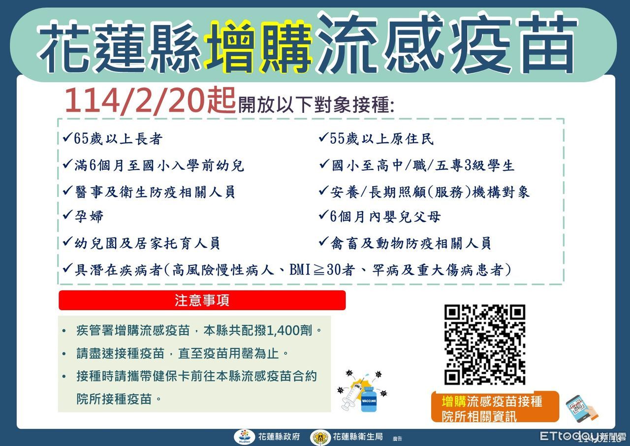 衛生福利部疾病管制署增購10萬劑流感疫苗,花蓮縣共配賦1,400劑,將於本114年2月20日起提供11類高危險群對象接種,直至疫苗用罄為止,符合接種對象且自去年10月1日後尚未接種流感疫苗者,可攜帶健保卡及相關證件,前往縣內13鄉鎮市衛生所及流感疫苗合約院所接種。