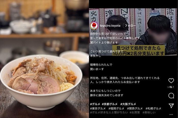 日本京都一間名為TOYOJIRO的拉麵店,因不滿顧客用餐後給予負評,竟然在社群媒體上公開顧客照片,甚至懸賞10萬日圓(約台幣2.2萬元)徵求該顧客的詳細資訊,還揚言處決顧客,極端行徑引發熱議。