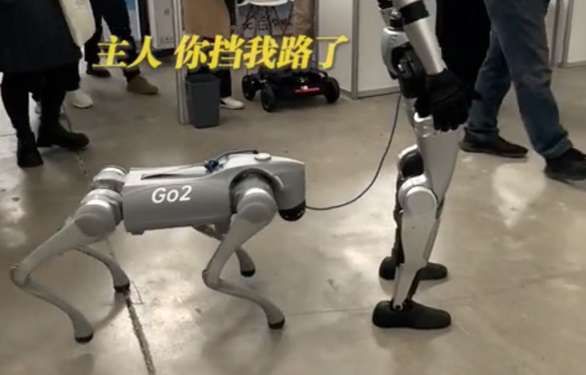 陸媒《澎湃新聞》今釋出畫面顯示,宇樹Unitree G1人形機器人在現場「遛狗」,手裡牽著的是宇樹推出機器狗。機器人一步一步十分穩健往前走,機器狗穩穩跟在後面,有如人類牽狗散步。