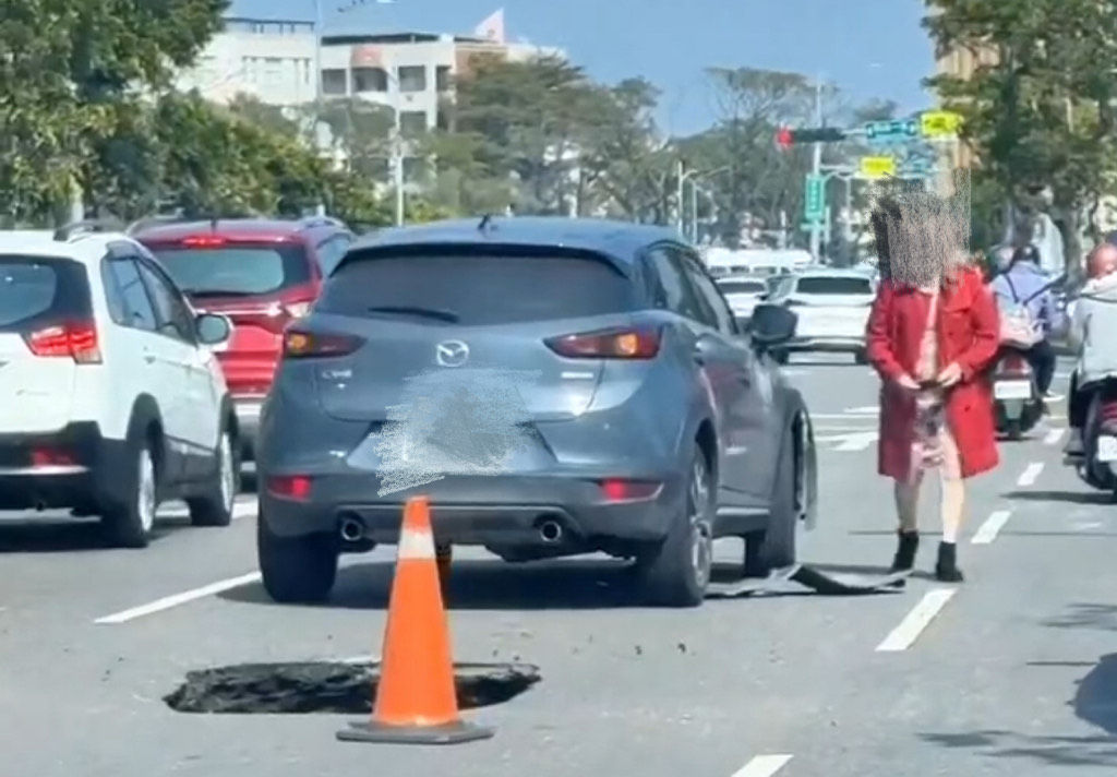 高雄市鼓山區好市多附近的龍德新路昨天下午2時許,突然出現一個一米寬左右的天坑,一名61歲張姓女子駕駛自小客車行經該路段時,因沒注意到坑洞輾過,導致車輛前保險桿受損,警方獲報趕赴現場,立即實施交通管制,確保行車安全。