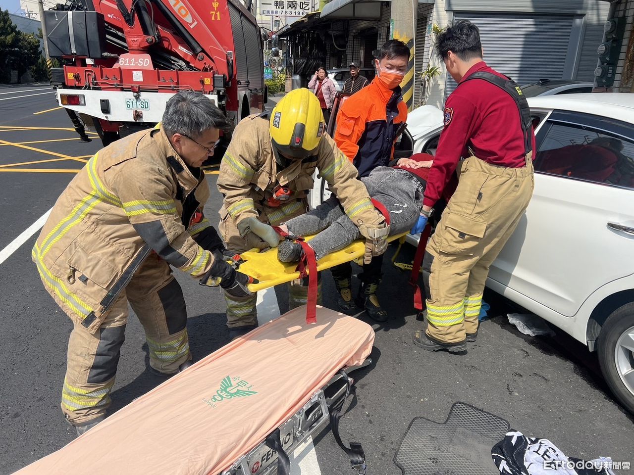▲台南市學甲區華宗路24日中午發生1起汽機車車禍事故,女駕駛受困車內,消防人員搶救小客車69歲女駕駛脫困,並將陳女等3人送醫。(圖/記者林東良翻攝,下同)