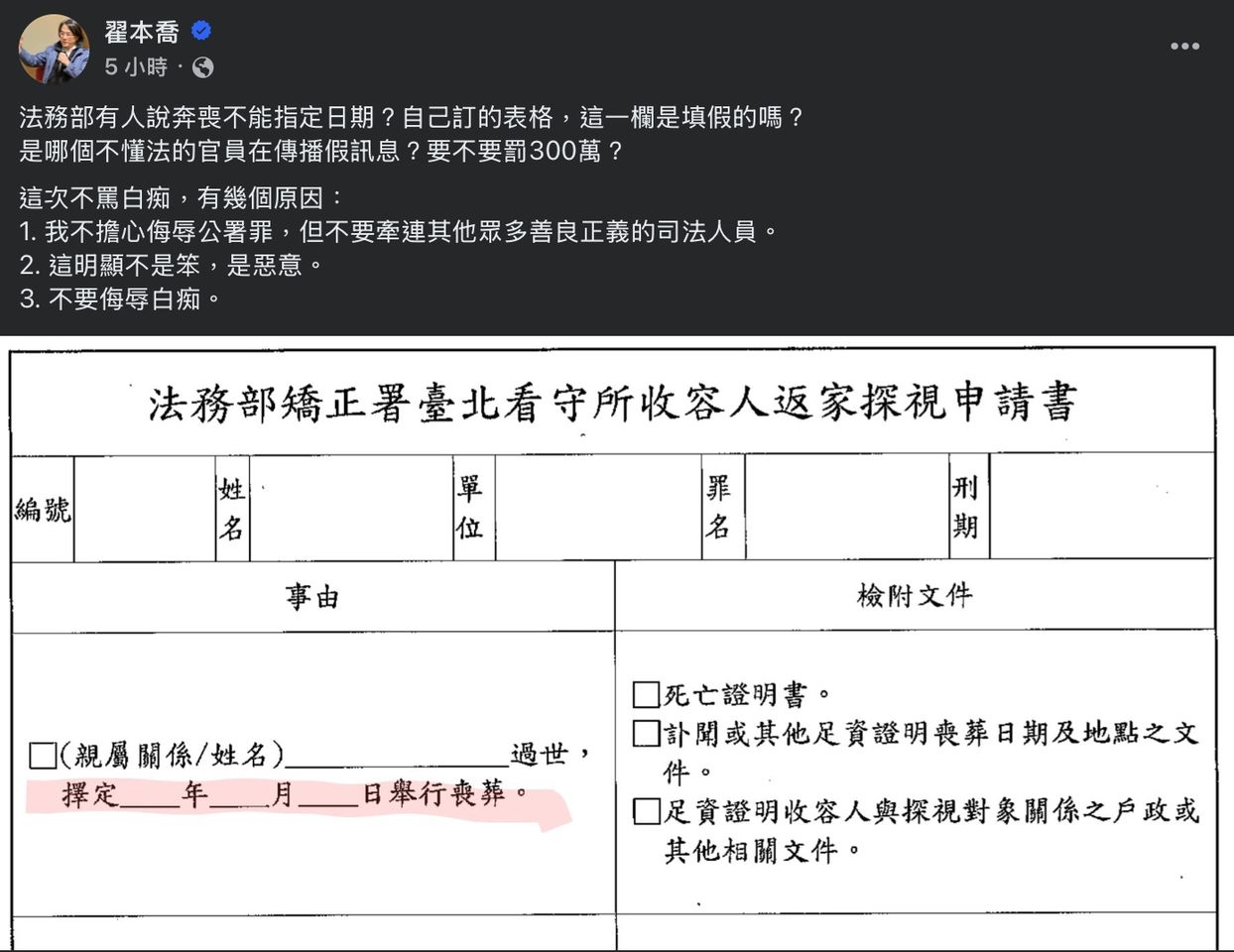 翟本喬24日於臉書發文貼出「矯正署台北看守所收容人返家探視申請書」,並將表格中的事由「擇定X年X月X日舉行喪葬」畫線,質疑「法務部有人說奔喪不能指定日期?自己訂的表格,這一欄是填假的嗎?是哪個不懂法的官員在傳播假訊息?要不要罰300萬?」