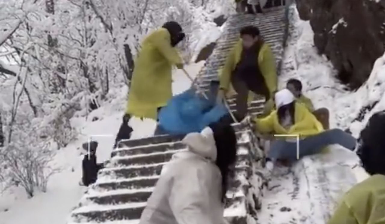 網傳影片顯示,因雪天路滑,登山步道化身「滑梯」,不少擔心摔倒的遊客坐在樓梯上援慢挪動下山,一些站不穩的遊客摔倒後一路沿步道滑下,有人差點滑到步道外,也有人不慎滑下樓梯後連撞數人,甚至有遊客頭朝下疾速滑落,失控撞上護欄。