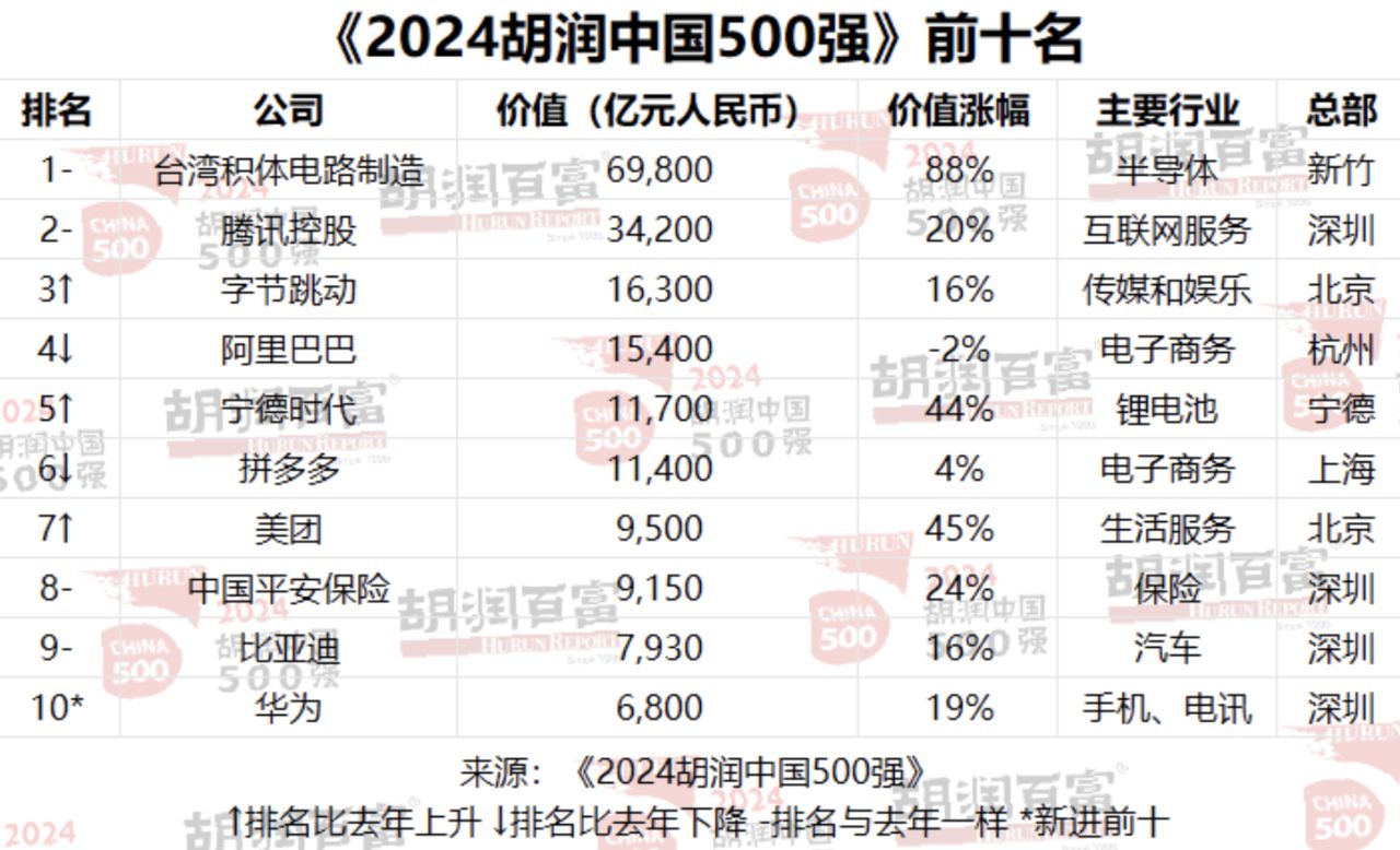 胡潤研究院今(25)日公佈2024年「中國500強」榜單,依照陸港澳台之企業價值進行排名,上市公司市值按照2024年11月15日的收盤價計算,非上市公司估值參考同行業上市公司或根據最新一輪融資情況進行估算。榜單揭曉後,台積電位居第一,騰訊居次,華為則以6800億元(人民幣,下同)的市值重返前十。
