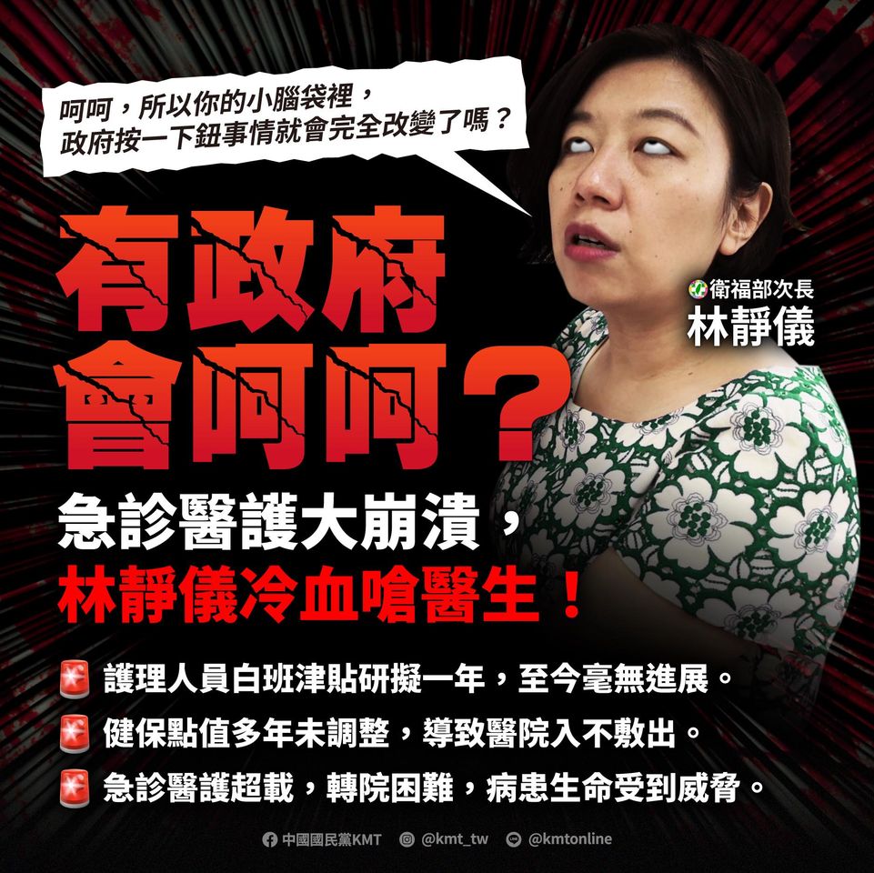 國民黨也透過臉書發文指出,面對台灣醫療體系的危機,政府的角色應該是負責任地解決問題,不是嘲笑那些挺身而出的醫護人員,急診醫護的怒吼不該被忽視,人民的生命安全不該成為冷血官僚的犧牲品。民進黨政府應立即面對問題,而不是繼續推卸責任,讓台灣的醫療體系徹底崩潰。