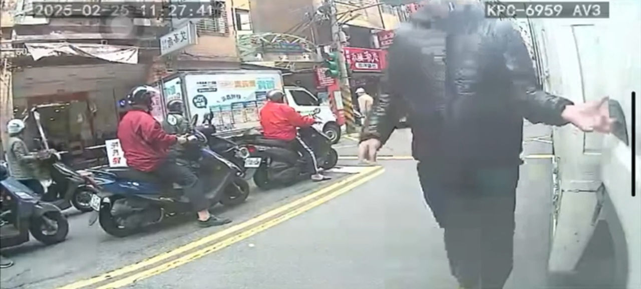 行車紀錄器捕捉到的畫面顯示,一名身著黑色衣褲、腳踩拖鞋的男子,原本行走於貨車左側的人行道。該男子先是觀察貨車駕駛座,確認車內無人且發現皮包後,便繞至貨車右側,開啟車門取走皮包。